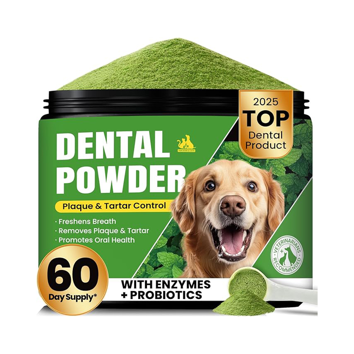 Say goodbye to stinky dog breath! Our Dog Teeth Cleaning Powder is enriched with green tea and mint, known for their natural breath-freshening properties.Our Dog Dental Powder offer a 60-day supply, providing twice as much as others on the market. This ample quantity ensures that you can maintain continuous oral care for your pet without the need for frequent reordering. o more toothbrush or dental sticks required—just mix our pet dental powder into your dog’s meals for easy, effective oral hygiene.Formulated by expert pet dentists, our product is made with tested and trusted ingredients that meet the highest safety standards.
